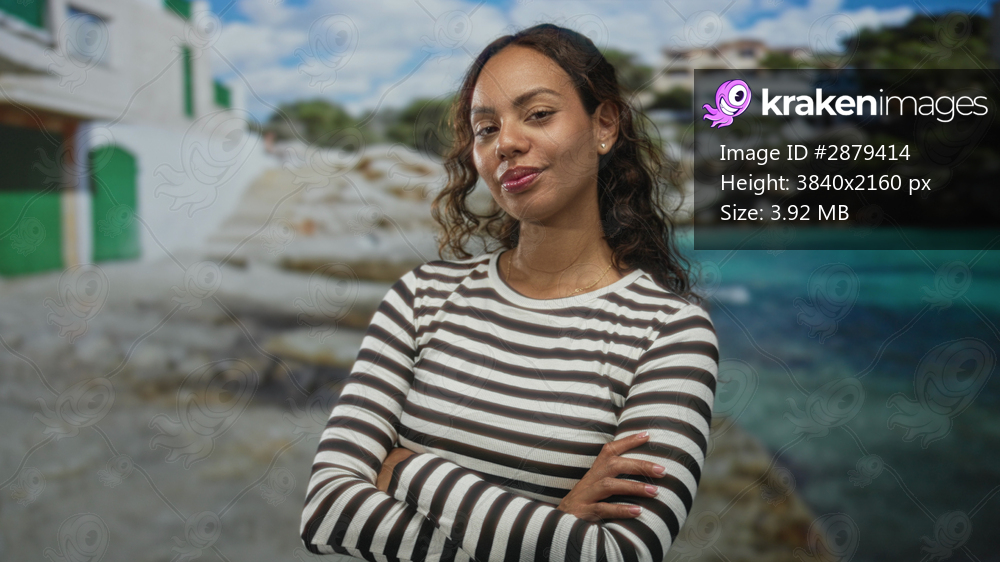 Woman smiling with arms crossed, hands visible and wearing striped shirt, posing in studio beach scene with turquoise sea; confidence.