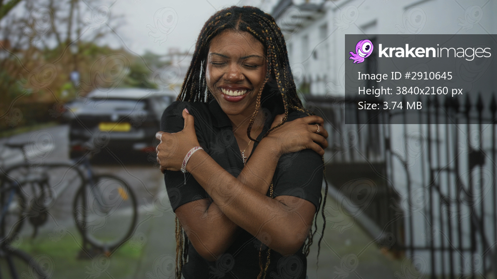Woman smiling with arms crossed hugging herself on a residential city street by parked bicycles and iron railings; self love joy.