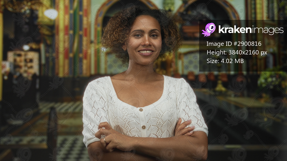 Woman smiling with arms crossed in building nave of catholic church wearing white knit top; calm confidence.