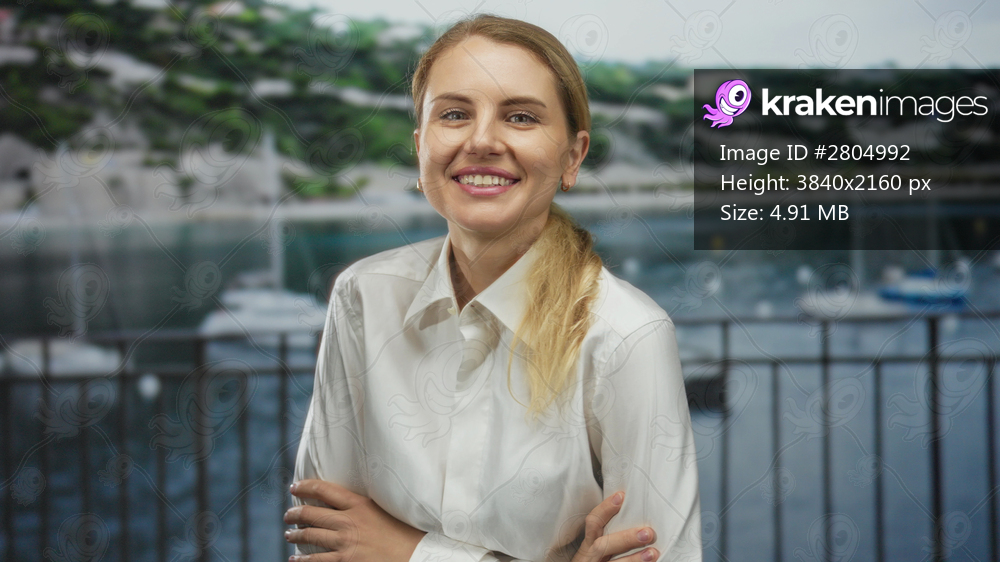 Woman smiling with arms crossed in front of boats at a marina, wearing a white shirt, with a scenic coastal background, conveying a sense of relaxation and confidence. - Kraken Images