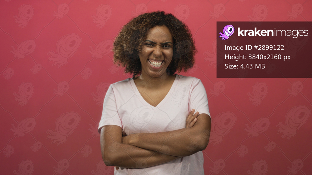 Woman smiling with arms crossed in pink studio, curly hair, relaxed pose and direct gaze; confidence.