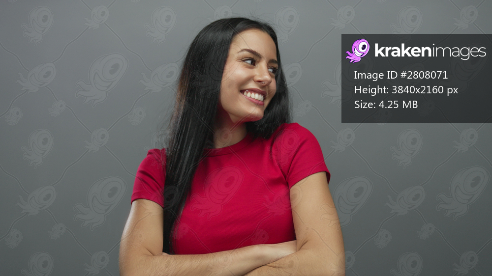 Woman smiling with arms crossed in red shirt against a grey background conveying confidence and happiness.