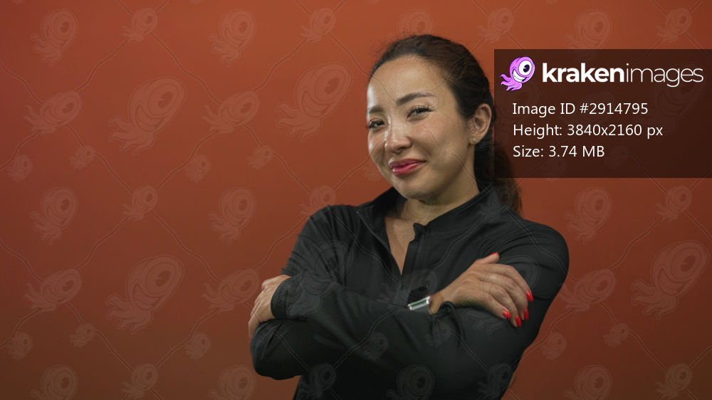 Woman smiling with arms crossed in studio against orange backdrop wearing black top and smartwatch; confidence.