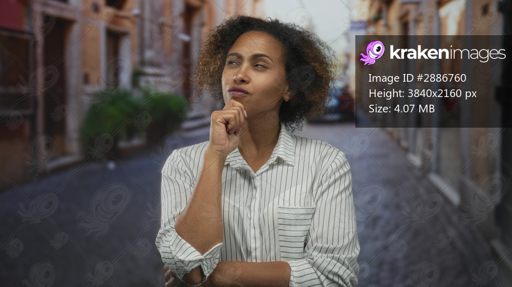 Woman smiling with arms crossed on a cobblestone street flanked by old buildings and a parked car; confidence approachability thoughtfulness.
