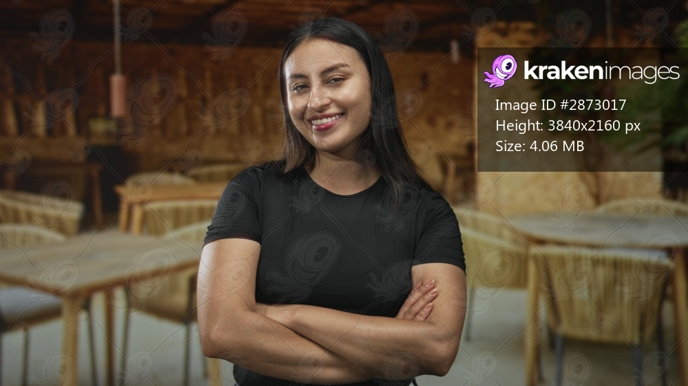 Woman smiling with arms crossed on a restaurant terrace outdoors wearing a black t shirt; confidence.