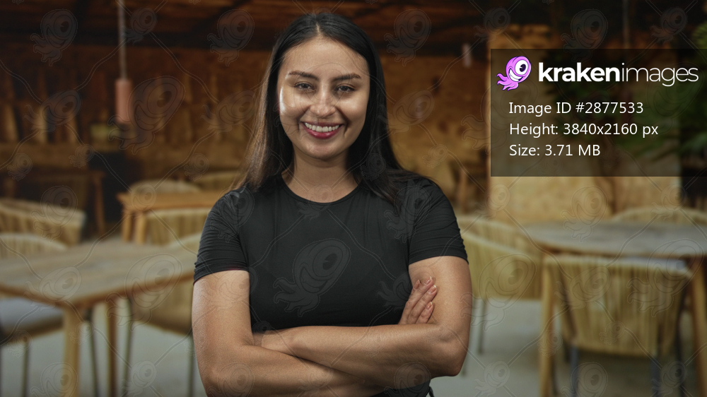 Woman smiling with arms crossed on a restaurant terrace outdoors wearing a black t shirt; confidence.
