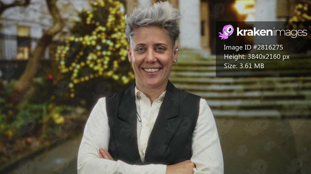 Woman smiling with arms crossed on city street steps in front of festive lights by building; confidence.