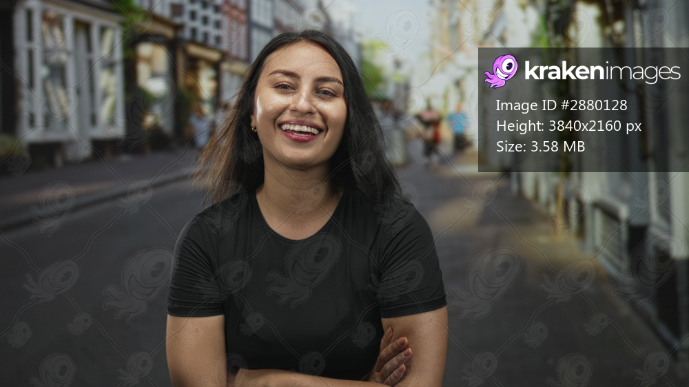 Woman smiling with arms crossed on street in front of storefront and buildings, wearing black t shirt; confidence empowerment community.