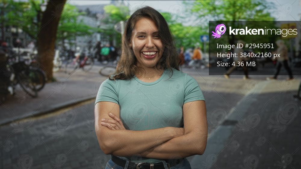 Woman smiling with arms crossed on street near parked car and bicycles; confidence resilience community.