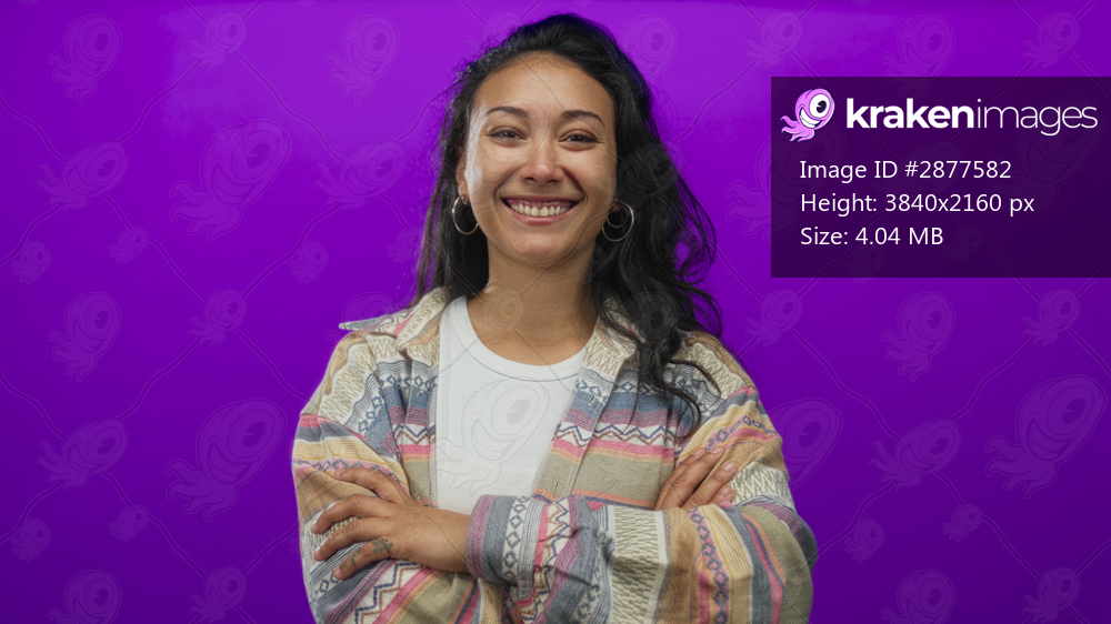 Woman smiling with arms crossed and visible hands in studio against purple backdrop; confidence empowerment warmth.