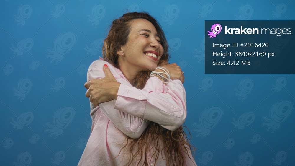 Woman smiling with arms outstretched and hands reaching in blue studio wearing pink shirt; warm friendly welcome joy.