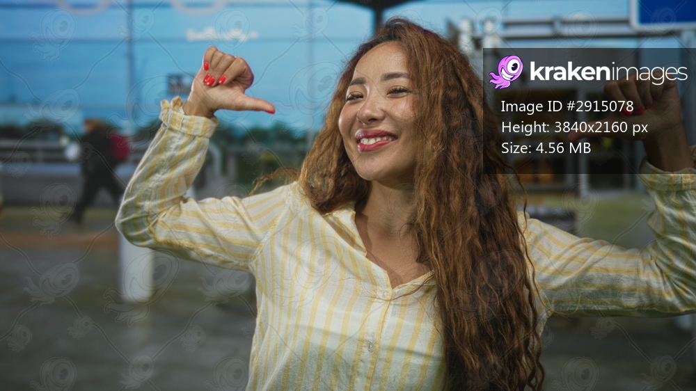 Woman smiling with arms outstretched in a yellow striped shirt by airport terminal entrance, long curly hair framing face; travel joy welcome.
