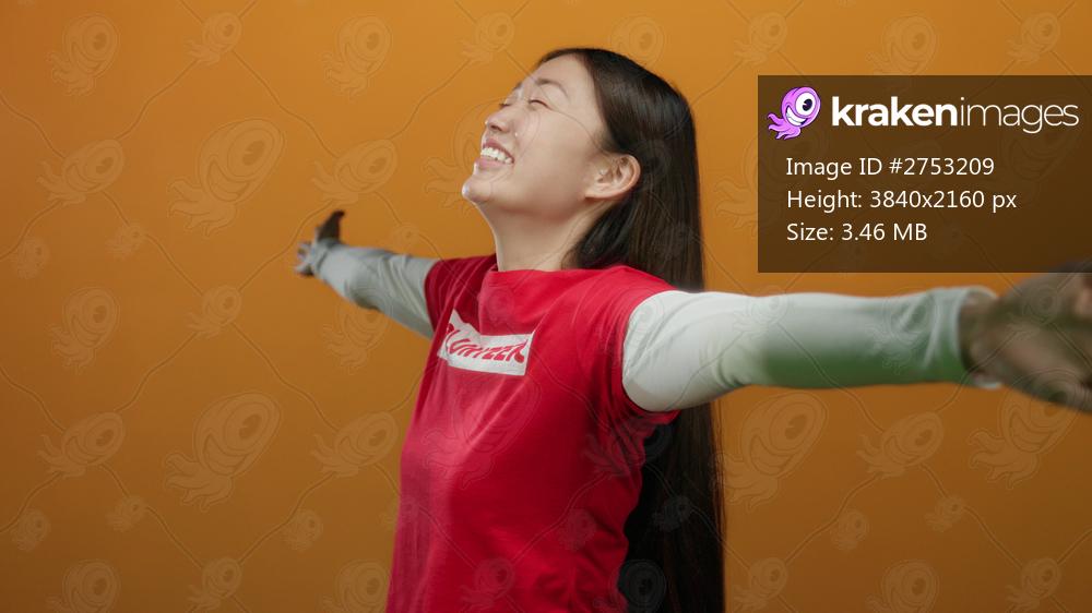 Woman smiling with arms outstretched in front of an orange wall, exuding joy and freedom, embodying happiness, positivity, and vibrancy in a modern and isolated setting. - Kraken Images