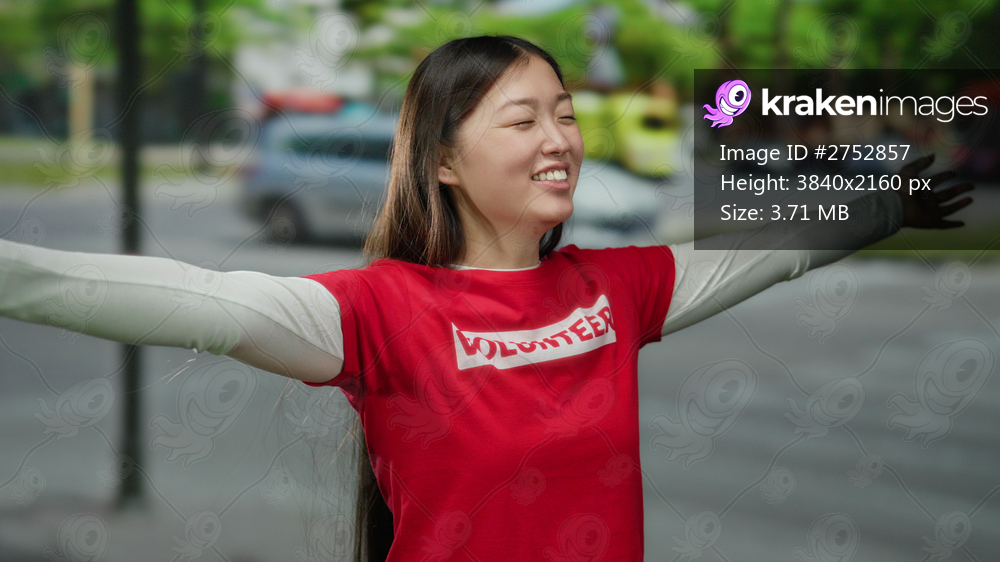 Woman smiling with arms outstretched wearing volunteer shirt in an urban street environment, embracing the positive spirit of community and togetherness outdoors. - Kraken Images