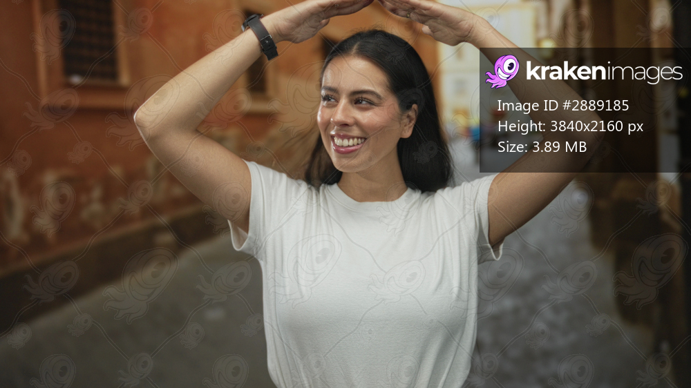 Woman smiling with arms raised above head on a cobblestone street wearing white t shirt and watch; happiness carefree travel.
