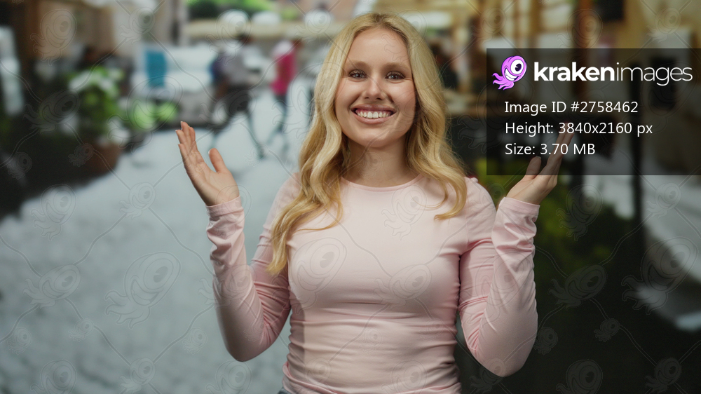 Woman smiling with arms raised on a sunny city street, conveying happiness and freedom in an urban environment, capturing the essence of outdoor city life. - Kraken Images