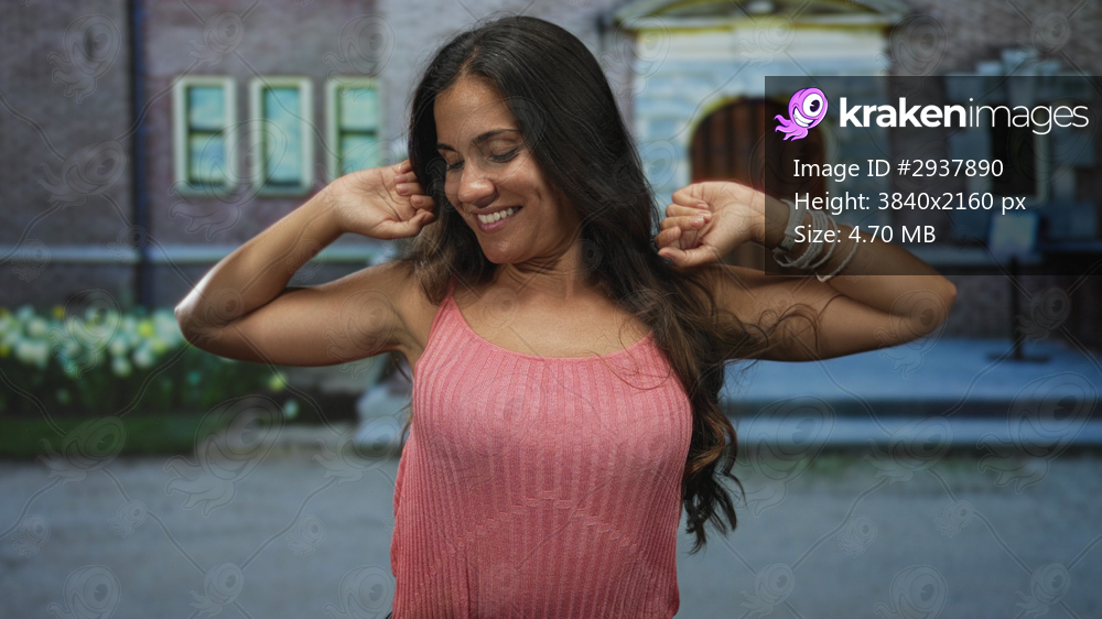 Woman smiling with arms raised showing armpit and long hair in a pink tank top at a building entrance with stone steps; carefree joy.