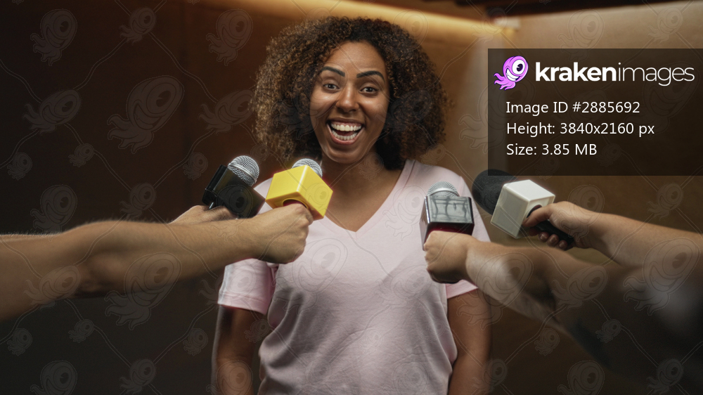 Woman smiling as multiple handheld microphones point toward her in a studio interview space; confidence empowerment voice.