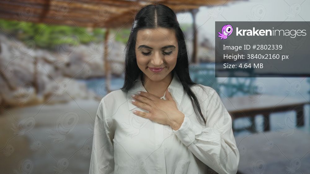 Woman smiling at a seaside setting with blurred background, showcasing a calm and peaceful demeanor on a sunny day at the beach with a serene ocean view. - Kraken Images