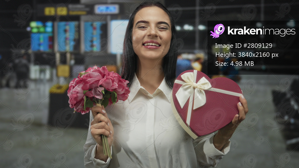 Woman smiling at airport holding a pink flower bouquet and a heart-shaped gift box, embodying happiness and warmth in an indoor setting.
