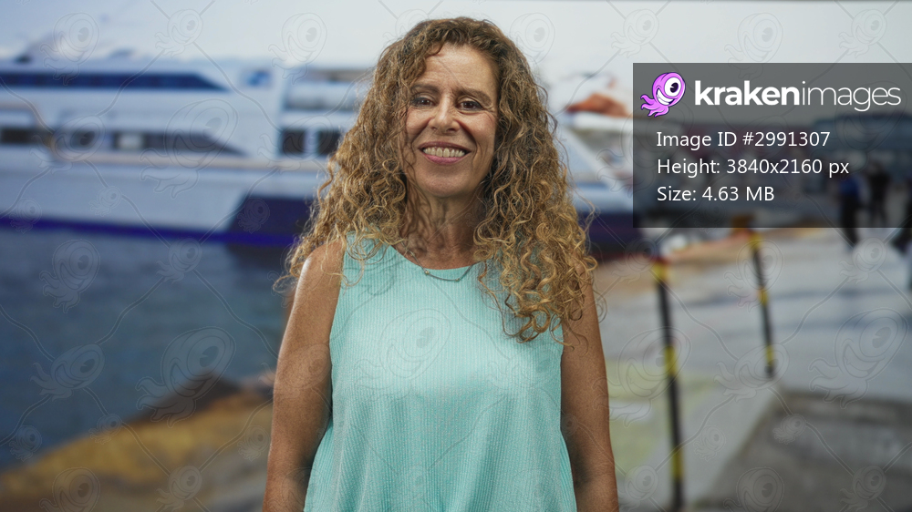 Woman smiling at camera with a boat behind, standing on a street in a sleeveless turquoise top; contentment seaside memory.