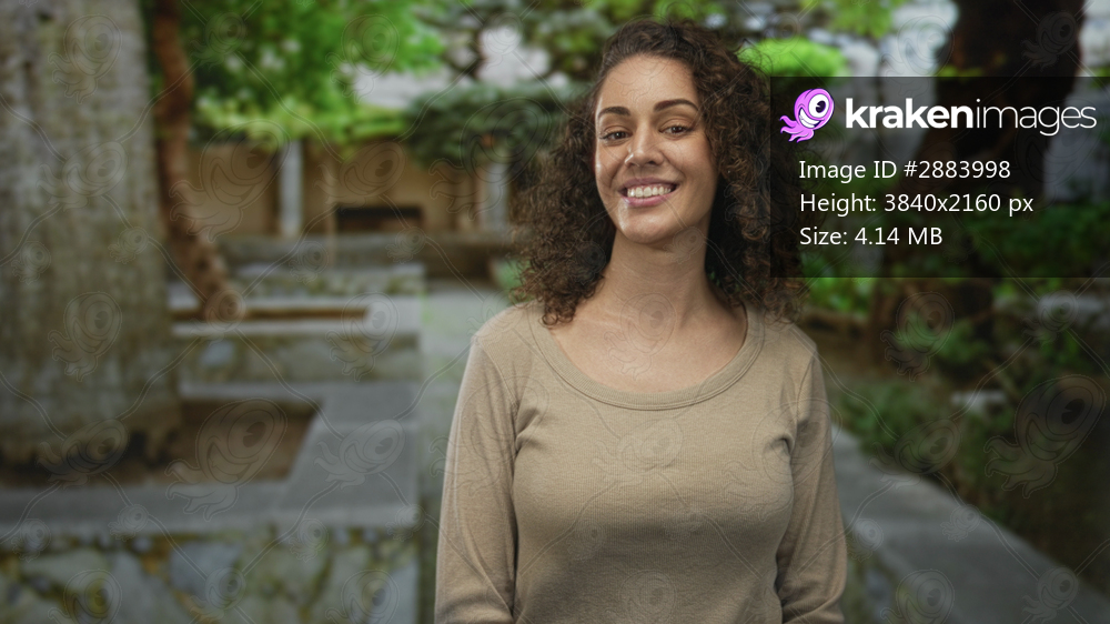 Woman smiling at camera with curly hair and visible neck, standing on a stone park walkway beside a low stone building and trees, wearing a beige sweater; warmth connection happiness. - Kraken Images