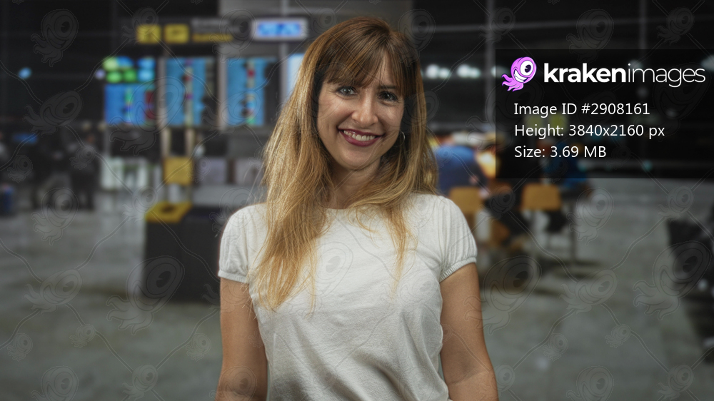 Woman smiling at camera in airport terminal wearing white t shirt and showing bare arms, standing near departure boards; travel contentment.
