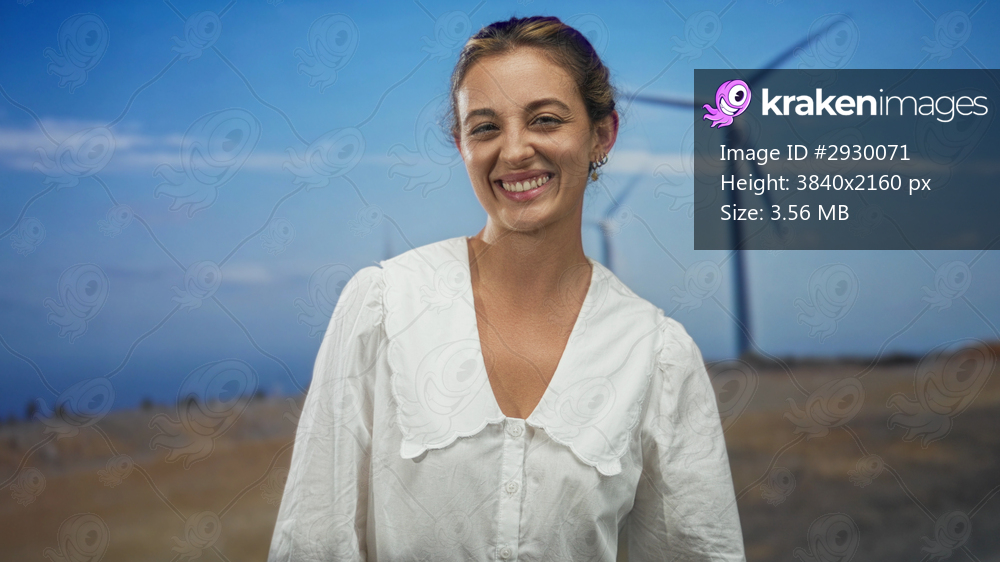 Woman smiling at camera with windmill behind in building field, white blouse and exposed collar visible; serenity sustainability.