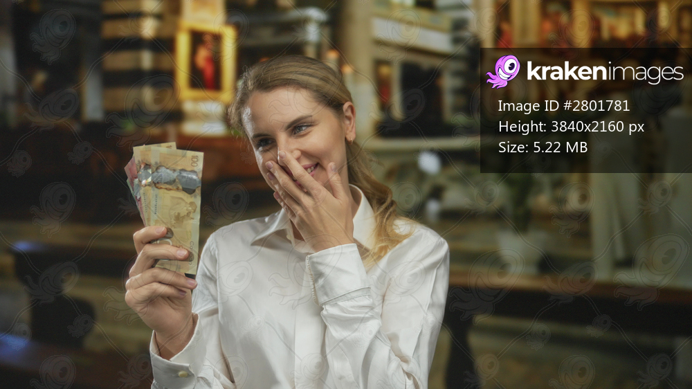Woman smiling at canadian banknotes indoors at a church setting, showcasing joy and financial success in an unexpected location, highlighting a juxtaposition between wealth and spirituality. - Kraken Images