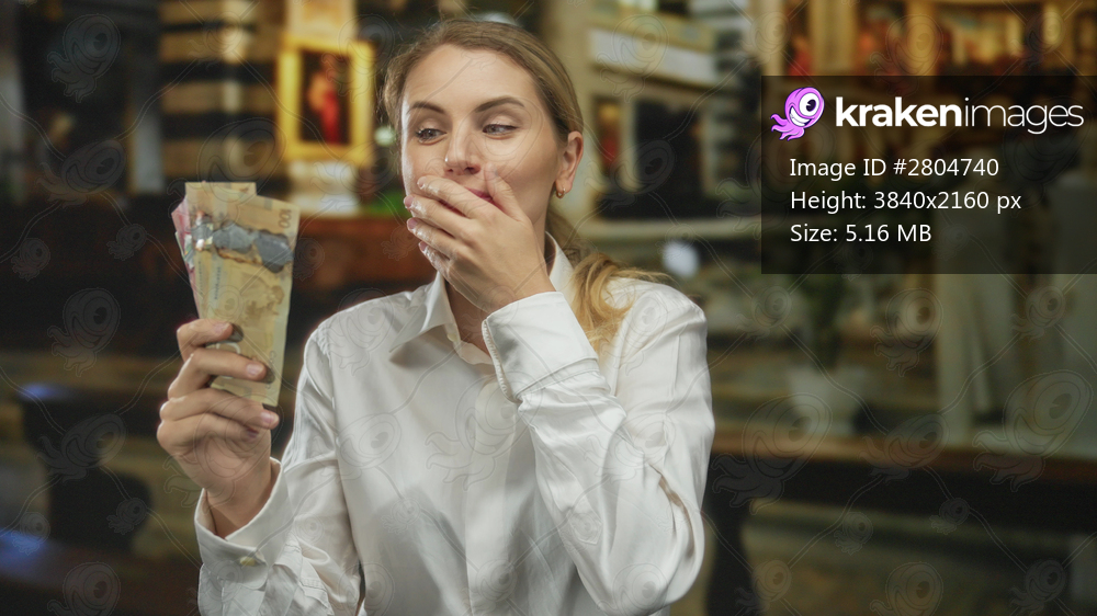 Woman smiling at canadian banknotes indoors at a church setting, showcasing joy and financial success in an unexpected location, highlighting a juxtaposition between wealth and spirituality. - Kraken Images