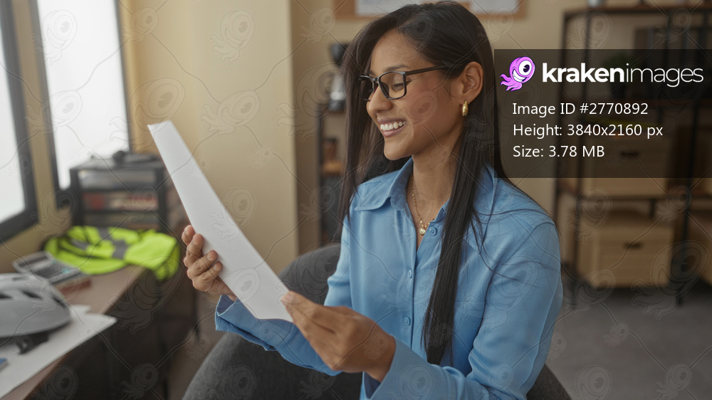 Woman smiling at document in modern office reflecting success mood with latin flair and corporate environment, exuding contentment in her workspace.