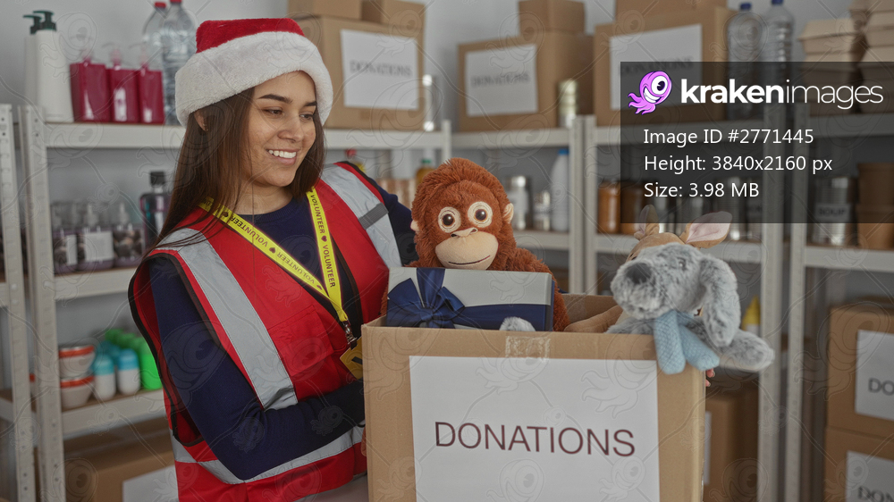 Woman smiling at donations center in santa hat with red vest holding box of toys surrounded by shelves indoors.
