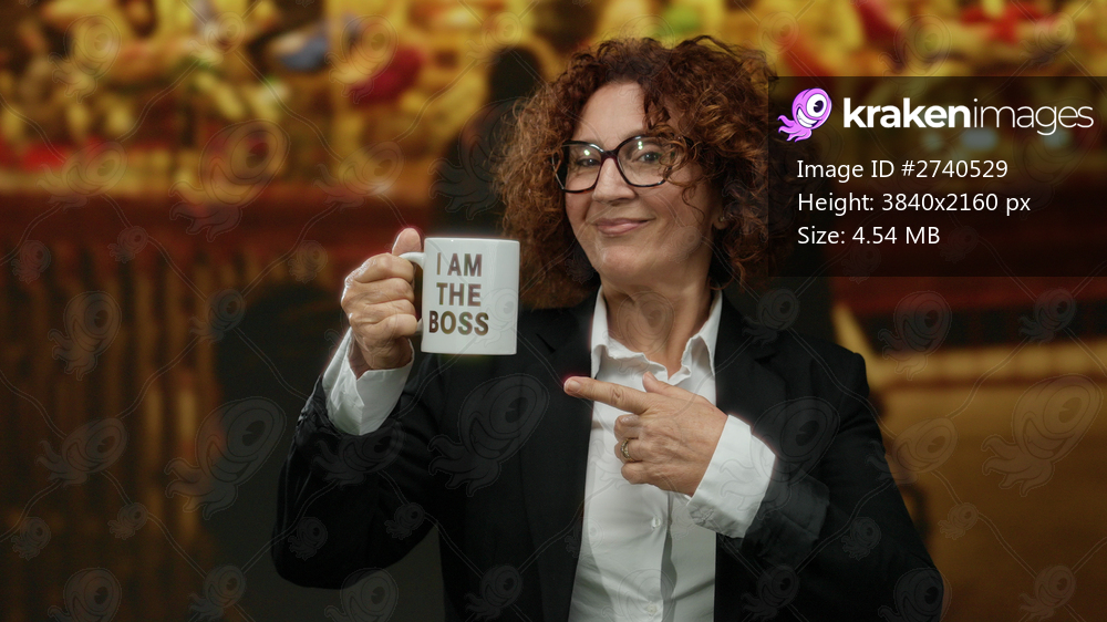 Woman smiling at fair holding cup with boss text playfully pointing while wearing glasses and suit in vibrant outdoor park.