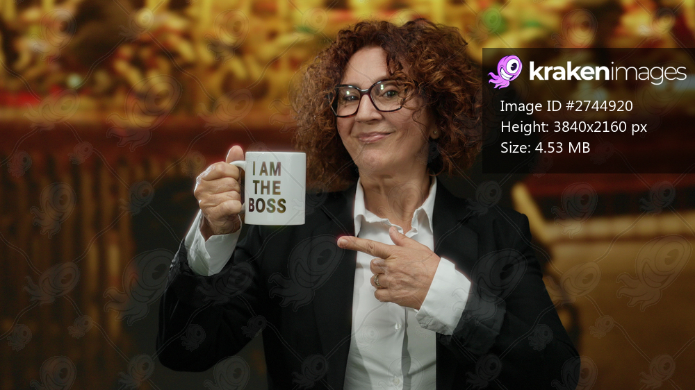 Woman smiling at fair holding cup with boss text playfully pointing while wearing glasses and suit in vibrant outdoor park.