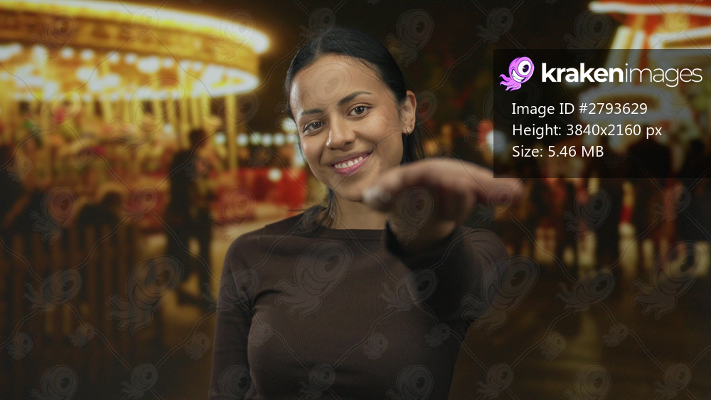 Woman smiling at night fair with illuminated carousel in background, capturing a joyful outdoor vibe enhanced by colorful lights and a lively atmosphere. - Kraken Images