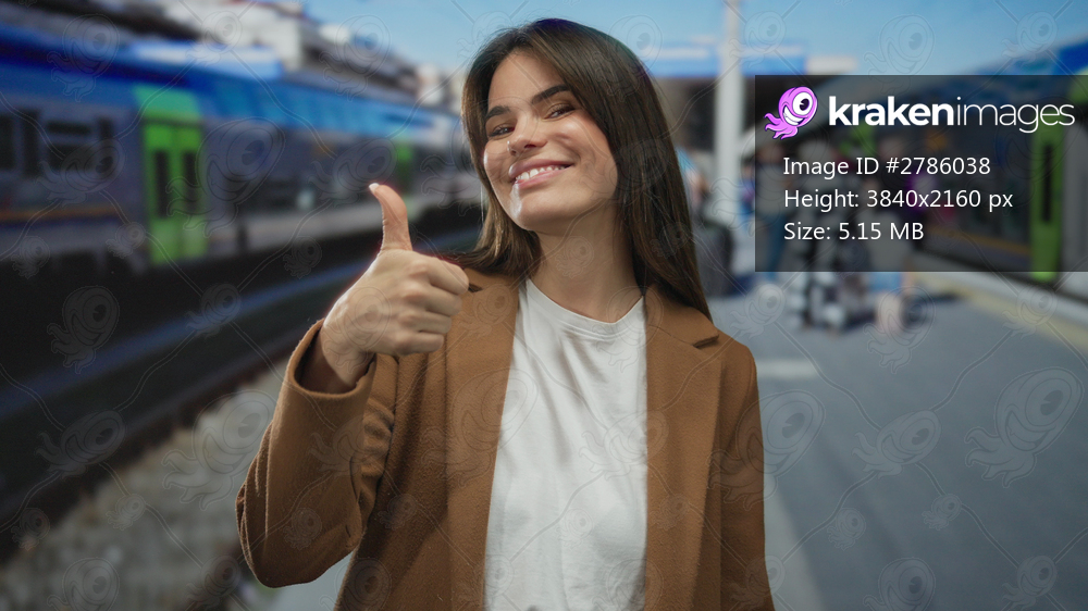 Woman smiling at outdoor train station gives a thumbs-up, capturing a cheerful moment amidst the bustling railway environment.