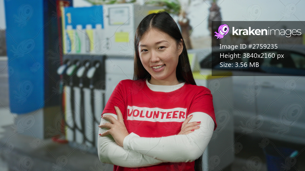 Woman smiling at petrol station wearing volunteer shirt with pumps and car in background, emphasizing a helpful and outdoor scene.
