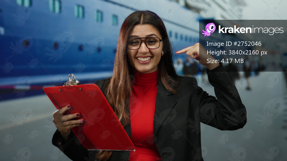 Woman smiling at port with clipboard, wearing glasses, standing outdoors near large boat with people in background, exuding confidence and professionalism in a vibrant setting. - Kraken Images