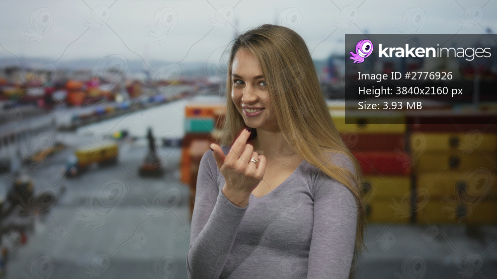 Woman smiling at port with ships and containers in background under cloudy sky offers friendly gesture.