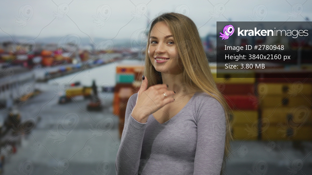 Woman smiling at port with ships and containers in background under cloudy sky offers friendly gesture.