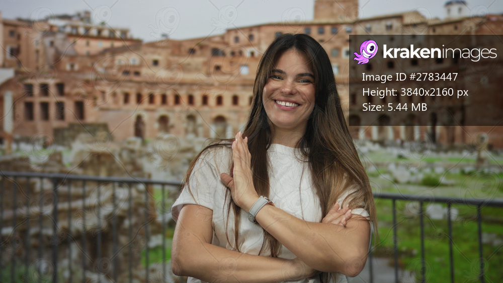Woman smiling at roman ruins backdrop, young hispanic with long hair and watch in city street depicting cultural exploration outdoors.