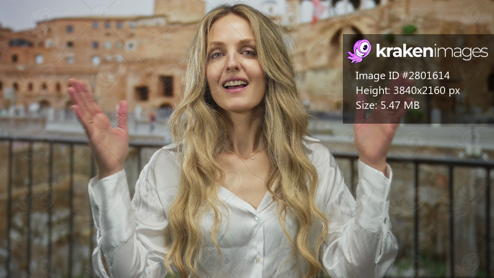 Woman smiling at roman ruins outdoors showing youthful energy and blonde hair against rome’s ancient brick streets.