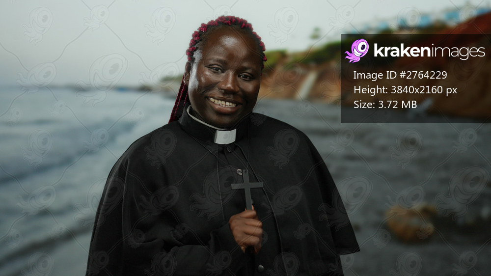 Woman smiling at seaside in clerical attire with a cross necklace, ocean waves and cliffs in background, radiating joy and spirituality amidst serene natural setting. - Kraken Images