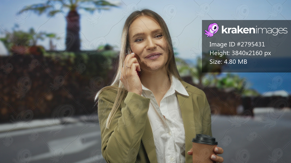 Woman smiling at seaside promenade holding coffee and talking on smartphone, showcasing a lively outdoor scene with a young, blonde, caucasian female enjoying her day. - Kraken Images