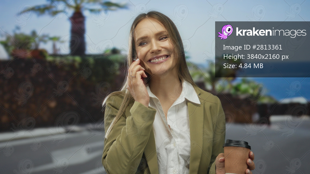 Woman smiling at seaside promenade holding coffee and talking on smartphone, showcasing a lively outdoor scene with a young, blonde, caucasian female enjoying her day. - Kraken Images