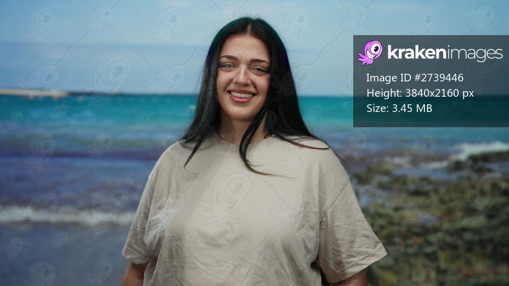 Woman smiling at seaside with turquoise sea in background under clear sky wearing casual beige t-shirt on beach