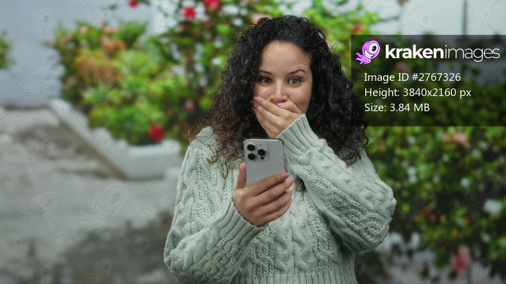 Woman smiling at smartphone while standing outdoors on a street, surrounded by vibrant greenery, conveying joy and connection in a natural setting.