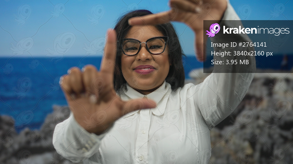 Woman smiling at the beach, forming a frame with her hands against a seaside backdrop, wearing glasses and a white shirt, enjoying a sunny outdoor day by the sea. - Kraken Images