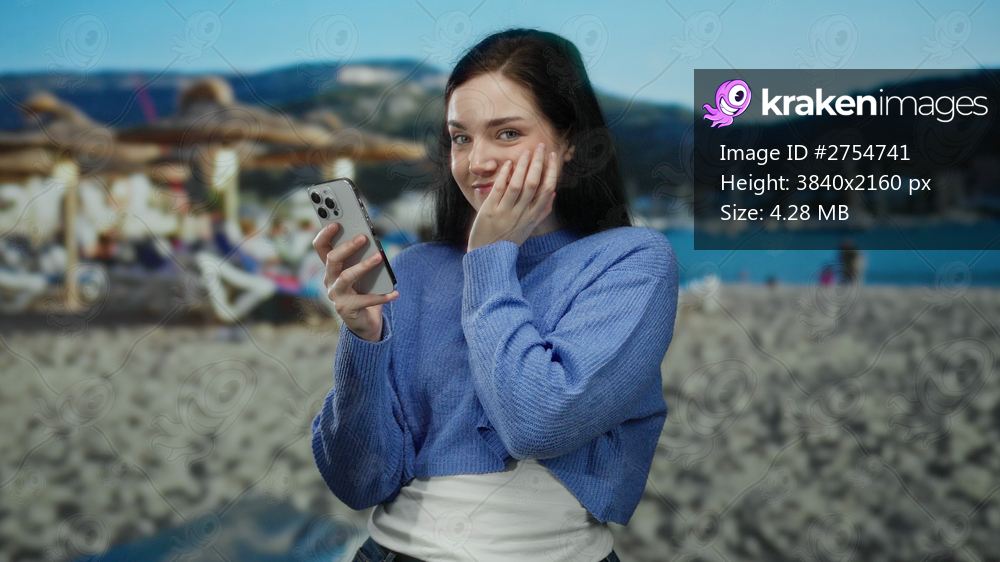 Woman smiling at the beach holding a smartphone against a backdrop of sea and mountains, capturing a serene moment on a sunny day.