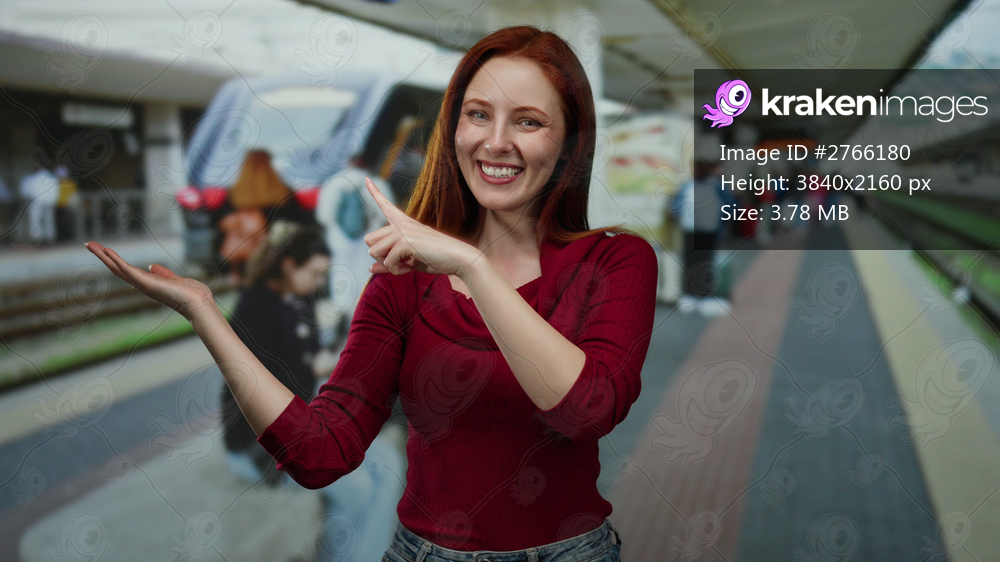 Woman smiling at train station, wearing red, pointing with hand, standing, outdoor setting, redhead, beautiful, adult, attractive, showcasing travel or transport scene.